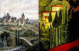 A la izquierda un espectacular paisaje realizado por Adolf Hitler y la derecha un gracioso dibujo del judío Modigliani, lo hemos citado ya que es un exponente propio del arte degenerado.